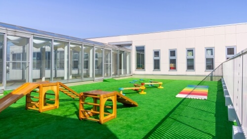 屋上スペースには人工芝を敷き詰めており安全に遊ぶことができます。